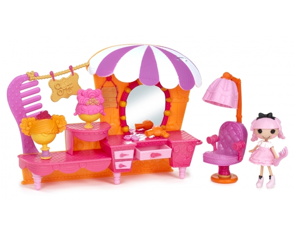 Новые персонажи Mini Lalaloopsy Принцессы — в наборе со множеством аксессуаров для трансформации с интерьером: -«Салон»: 3 прически, 1 пара обуви, аксессуары; 1 платье; -«Бутик»: 1 прическа, 1 пара обуви, аксессуары; 3 платья; -Меняйте элементы внешнего.
