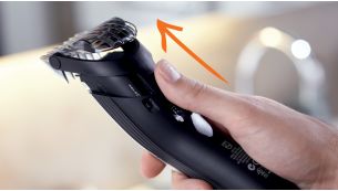 Используйте кнопки управления для точного выбора и фиксации нужных установок длины. Гребень обеспечивает точное подравнивание благодаря наличию более 60 установок: с шагом 0,2 мм (для установок от 1 до 7 мм) и с шагом 1 мм (для установок от 7 до 42 мм). Прибор можно использовать без гребня для подравнивания до минимальной длины 0,5 мм.