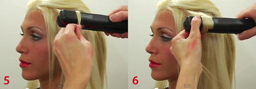 В хорошо прогретом утюжке (180-190 градусов) зажмите волосы у корней и медленно скользите вниз, одновременно наматывая конец пряди как показано на рисунке 3. Затем немного крутим утюжок (рисунок 4), и в это же время продолжаем наматывать прядь до тех пор, пока в результате свободный конец пряди оказывается между пластинами (рисунок 7). Теперь медленно протаскивайте прядь до конца через пластины. Имейте в виду, что во время всего процесса накручивания и протягивания волос, утюжок должен медленно, но без задержек, скользить к концу пряди. И не стоит сильно сжимать пластины, это затруднит продвижение пряди.