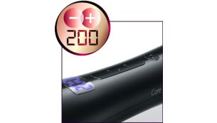 Нагрев до 200 °C позволяет уложить даже густые волосы, сводя к минимуму повреждение волос.