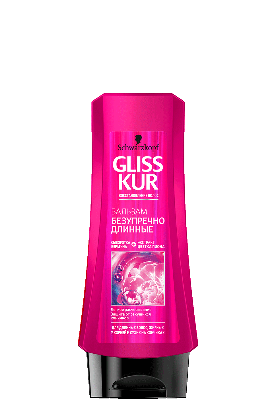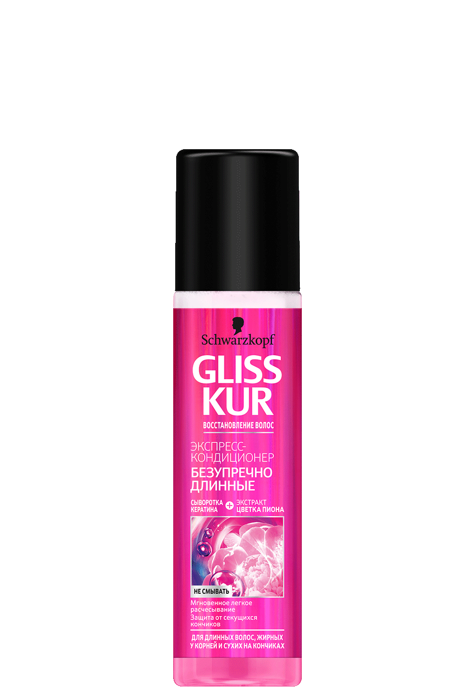 Формула экспресс-кондиционера Gliss Kur Безупречно Длинные с сывороткой кератина и экстрактом пиона проникает в самые глубокие слои волоса, помогает восстановить повреждения и обеспечивает мгновенное легкое расчесывание.