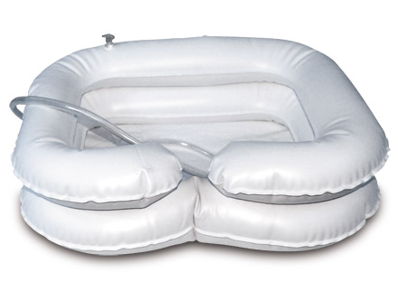 Обязательный атрибут ухода за лежачими и престарелыми пациентами — надувная ванночка-подголовник для мытья головы в постели. Очень удобна: фиксирует голову пациенту, снимает нагрузку с плеч. Позволяет полноценно вымыть голову, оставляя сухими другие части тела и постельное белье. Ванночка снабжена отверстием-сливом, через которое по присоединенному шлангу вода удаляется в ведро или таз.
