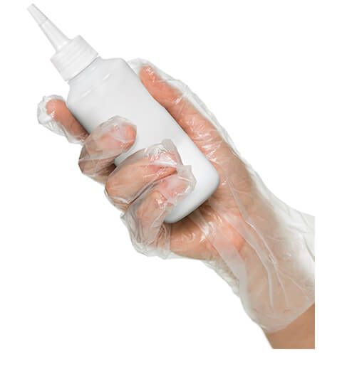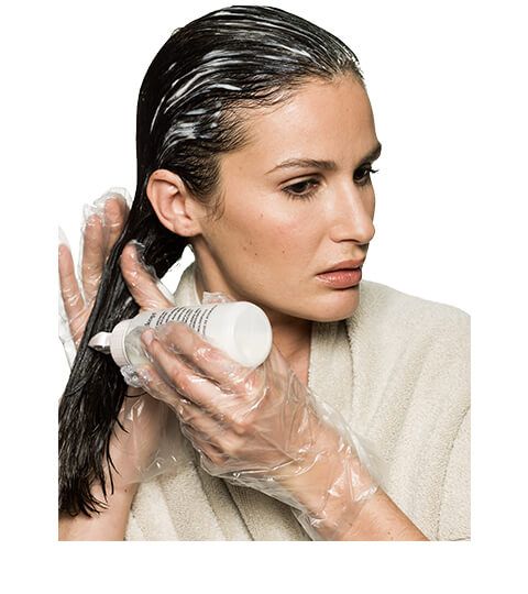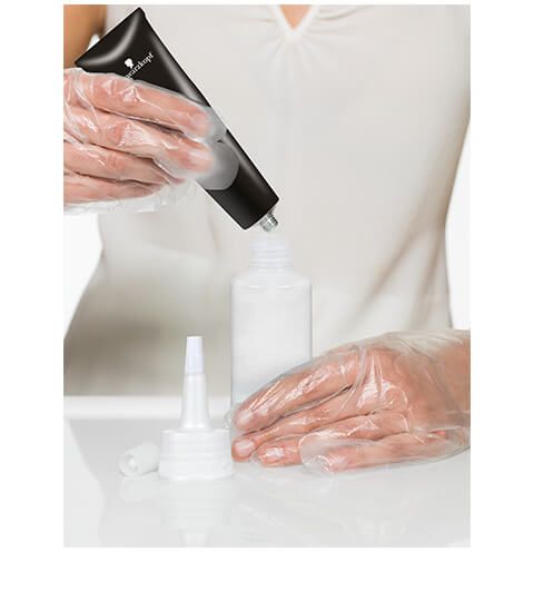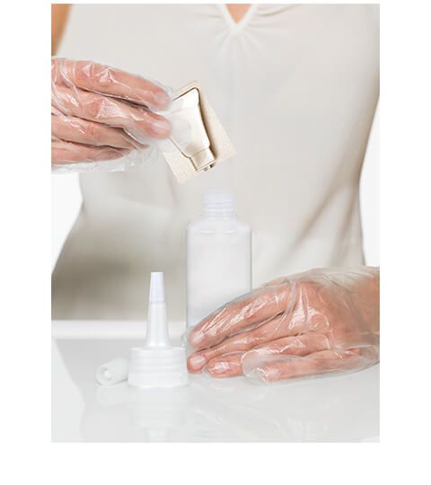Сначала нанесите 2/3 смеси только на отросшие волосы. Для этого проведите пробор с помощью наконечника флакона и равномерно распределите смесь вдоль пробора на отросшие корни волос кончиками пальцев (перчатки не снимайте!)