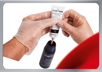 Наденьте перчатки, отвинтите крышку флакона с эмульсией. Откройте тюбик с окрашивающим гелем, проткнув его мембрану специальным шипом на обратной стороне крышки. Выдавите все содержимое тюбика во флакон для нанесения, тщательно закройте его. Хорошо встряхните флакон для того, чтобы содержимое полностью перемешалось.