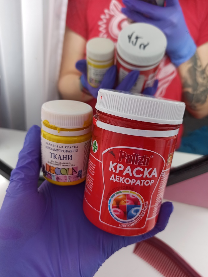 И так, я взяла ради эксперимента ту же акриловую краску по ткани, только жёлтого цвета и строительную акриловую красного