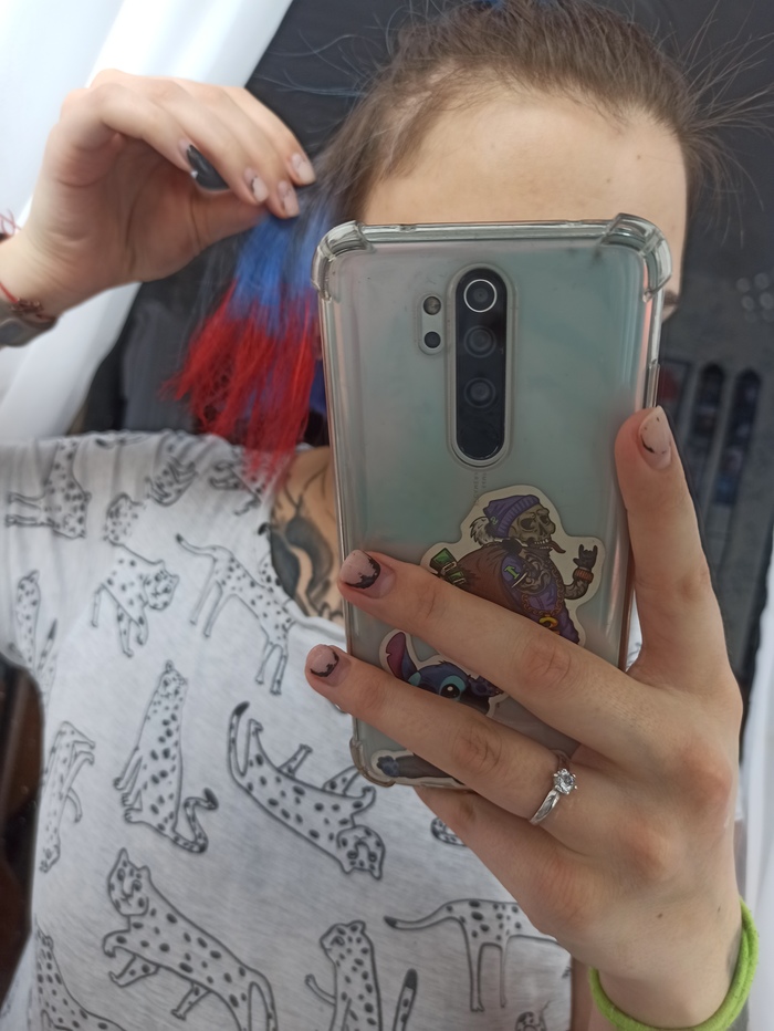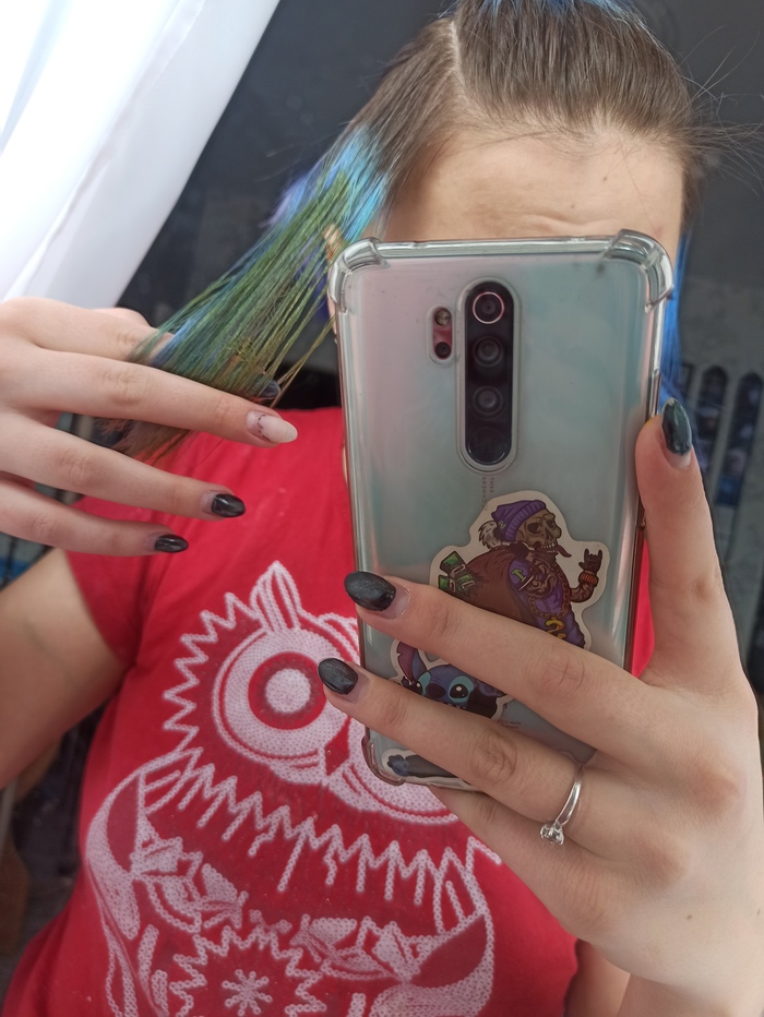 Естественно, так как это эксперимент, красить волосы сверху я не хотела, так что отделила их резинкой и красила по 1 пряди внутри.