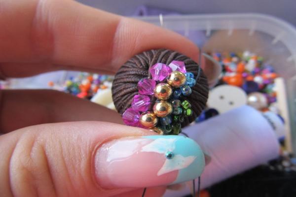 1. Пуговицу с тканевым верхом декорируем. Для этого начинаем пришивать рядами бусины. Чередуем различные бусинки и бисер, сочетаем цвета. В итоге должна получиться красивая аккуратная серединка