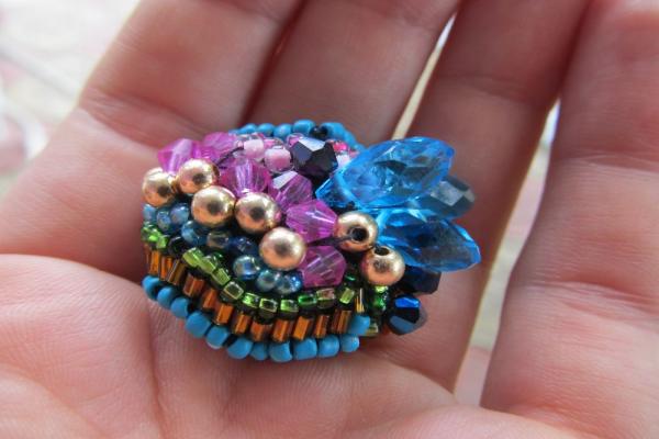 После того как всё вышито бисером, приступаем к пришиванию камней. Берём бисерину, скол и бисерину и по контуру начинаем пришивать, проходя каждый скол по два раза. Вышиваем сколом серединку, а свободные места между сколами заполняем бисером.