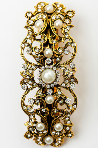 Заколку с застежкой-зажимом выполнили в форме двух овальных колец с перемычкой. Одно из них декорировали парой кубов с прозрачными миниатюрными кристаллами, второе – каплевидной подвеской из культивированного жемчуга. Для изготовления аксессуара использ.