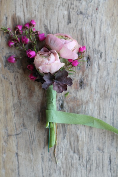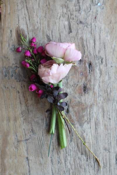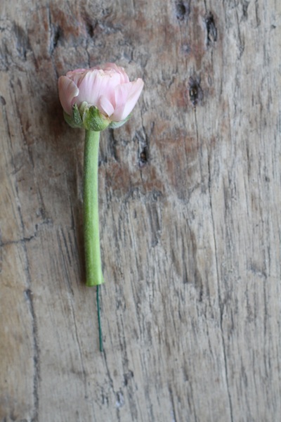 1. Ранункулусы очень красиво выглядят в виде бутоньерок. Но летом в жаркую погоду их головки могут склониться, именно поэтому обязательно проденьте проволоку внутри стебля прямо до головки цветка.