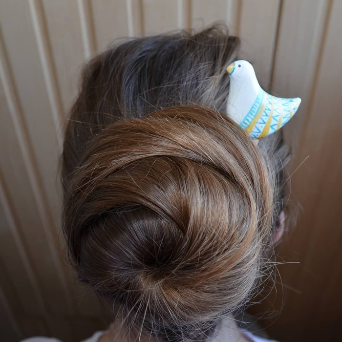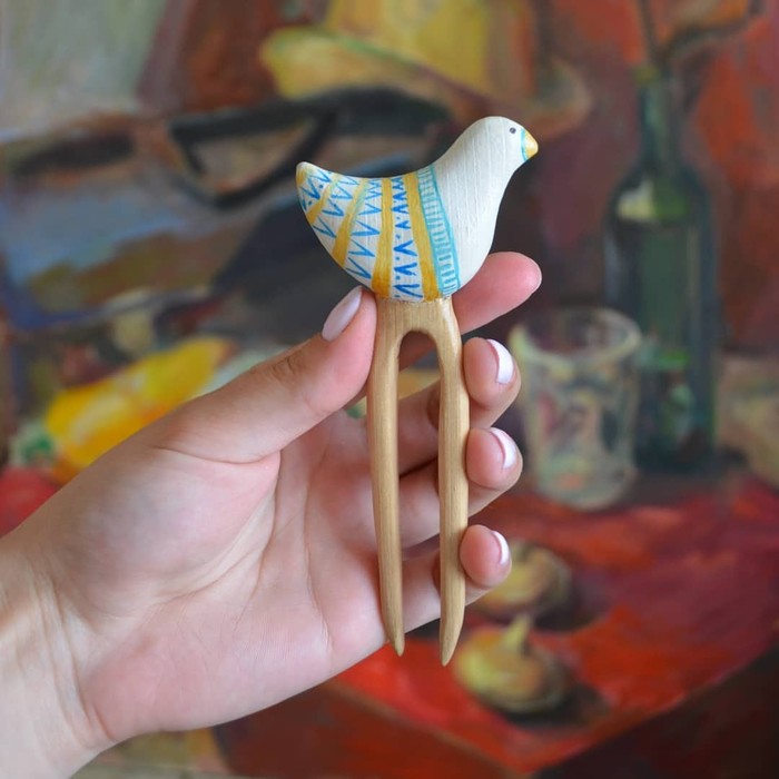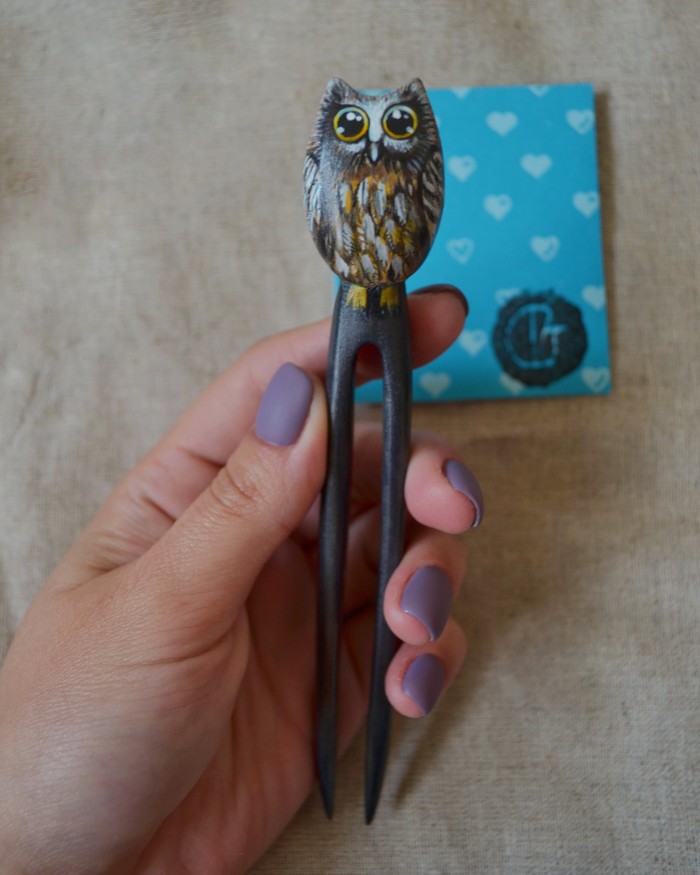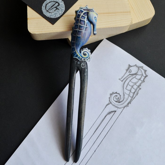 Далее следует этап резьбы ножами для придания формы и конечно же шлифовка. На этом этапе мы имеем что-то уже похожее на красоту и все же добавляем жизни нашему изделию- роспись. Готовую заколку покрываем 3 слоями акрилового лака и вуа-ля!